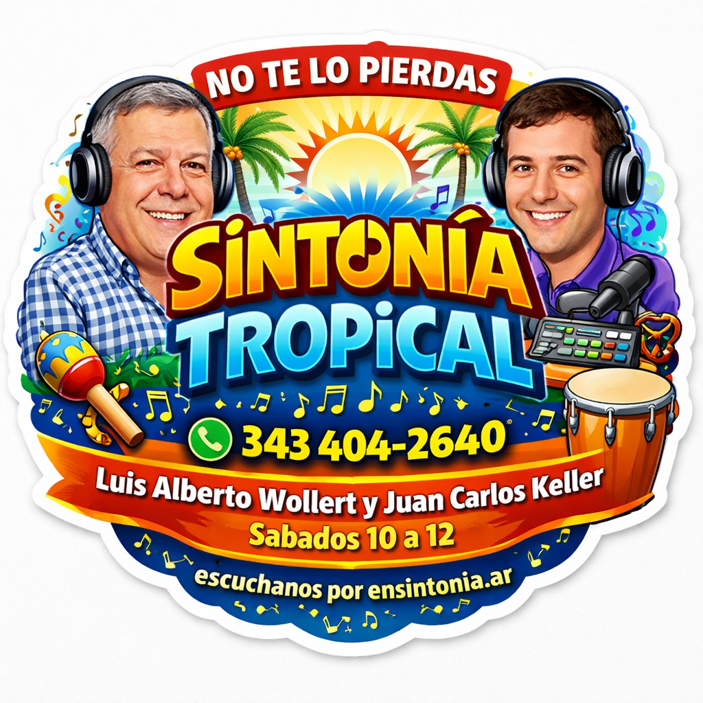 Sintonía Tropical, con la conducción de Luis Alberto Tito Wollert y la operación técnica y selección musical de Juan Carlos “Cucha” Keller. Dos horas dedicadas a la cumbia y el cuarteto, con mensajes y participación de la audiencia. Los Sábados de 10:00 a 12:00.